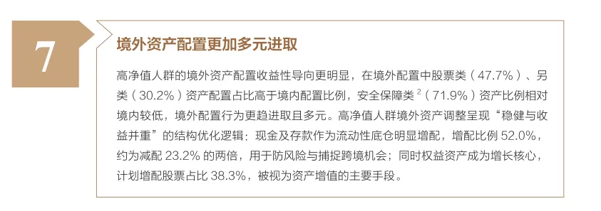 核心数据:境外资产中,股票类(47.7%)、另类资产(30.2%)占比高于境内配置比例;未来一年,52.0%计划增持现金及存款(流动性底仓),38.3%计划增持股票(增值核心)。
