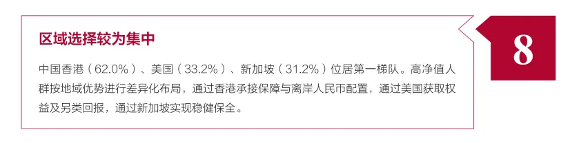 核心数据:中国香港(62.0%)、美国(33.2%)、新加坡(31.2%),是境外资产配置的第一梯队。香港侧重保障与离岸人民币配置,美国侧重权益及另类回报,新加坡侧重稳健保全。