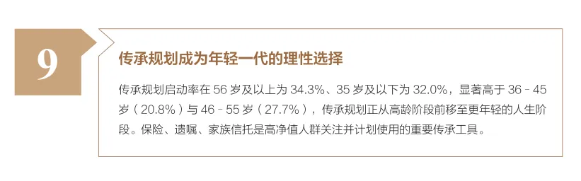 核心数据:传承规划启动率,56岁及以上为34.3%,35岁及以下为32.0%,显著高于中间年龄段。保险、遗嘱、家族信托,是高净值人群最关注的三大传承工具。