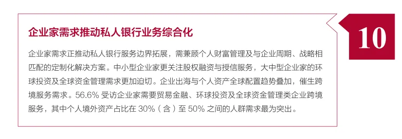 核心数据:56.6%的受访企业家,需要贸易金融、环球投资等跨境企业服务,其中个人境外资产占30%(含)-50%的人群,需求最突出。中小型企业家关注股权融资、授信服务,大中型企业家关注全球资金管理。