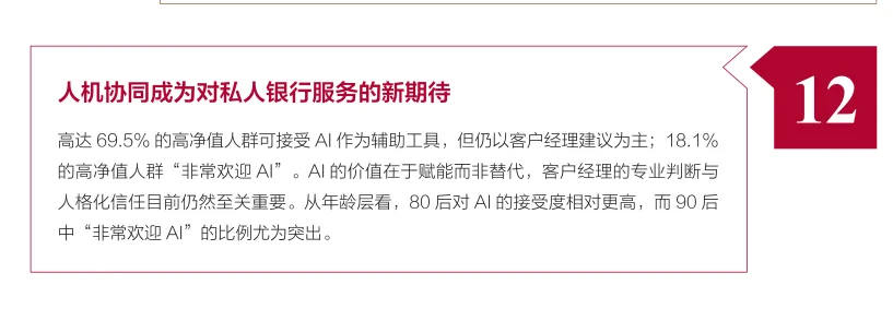 核心数据:69.5%的高净值人群可接受AI作为财富管理辅助工具,但核心决策仍依赖客户经理;18.1%的人群“非常欢迎AI”,其中90后接受度最高。