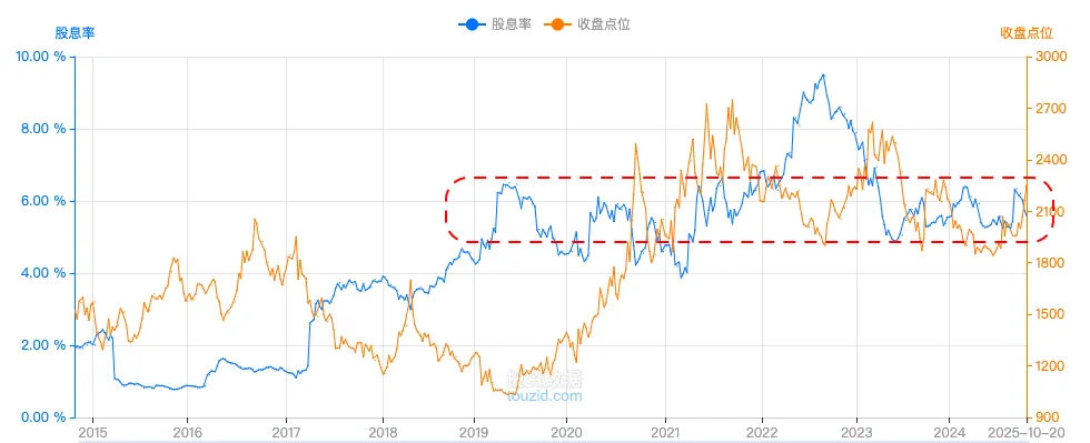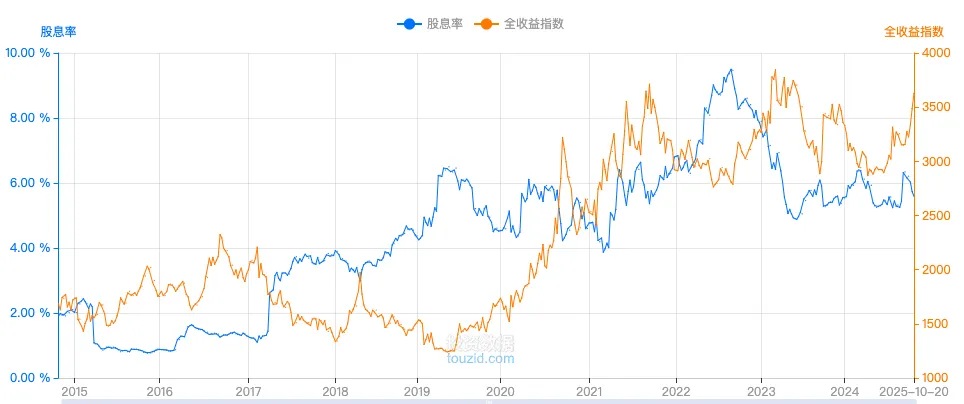 下图,全收益指数包含分红收益,能看到从2022年之后,与收盘指数的走势分道扬镳。说明高股息分红对指数估值的支撑效果。