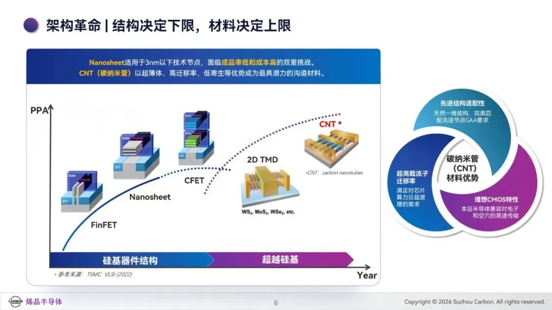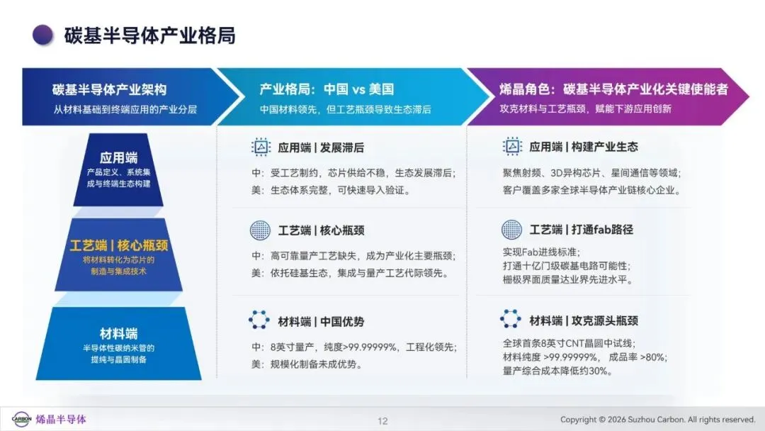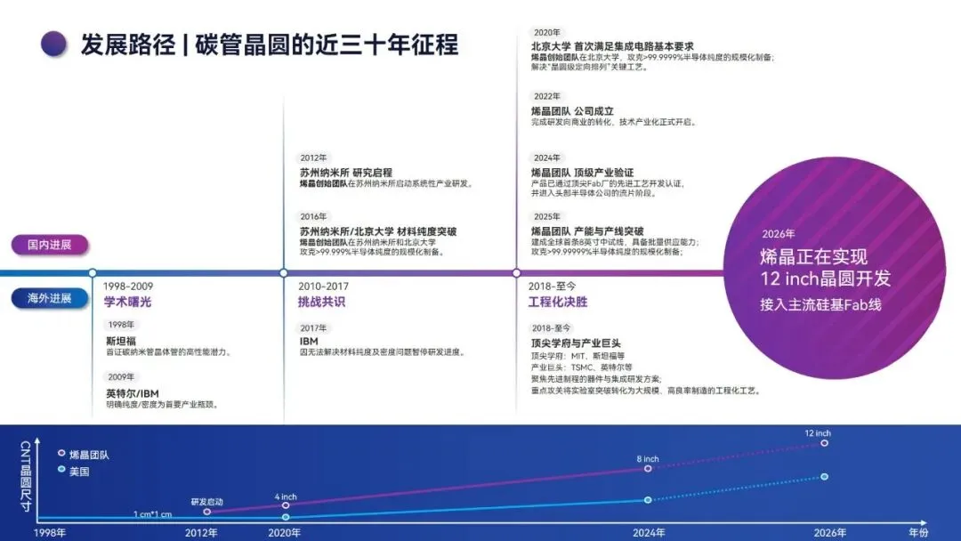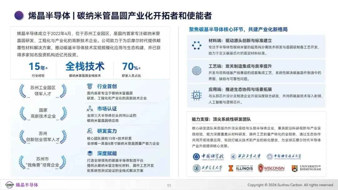 后摩尔时代下,硅基芯片受物理极限与经济成本制约,先进制程发展遇阻,全球半导体产业面临架构与材料的双重革新需求。碳纳米管凭借高迁移率、天然适配先进节点全环绕栅极结构等特性,成为突破硅基瓶颈的核心沟道材料,为集成电路发展提供了颠覆性解决方案。当前全球碳基半导体研发多点布局,美国主导系统架构创新,欧洲聚焦特色器件研发,日韩深耕高端制造与垂直整合,而中国在碳纳米管材料提纯与晶圆制备领域实现全球领先,形成差异化竞争优势。苏州烯晶半导体作为碳纳米管晶圆产业化开拓者,完成了从实验室技术到工程化量产的关键突破,构建了全栈式技术体系与产业化平台。本白皮书系统梳理碳纳米管晶圆的产业背景、技术路径、产业化进展及应用前景,剖析碳基半导体产业格局与发展痛点,展现碳纳米管在后摩尔时代集成电路领域的应用潜力与产业化价值,为行业发展提供参考。