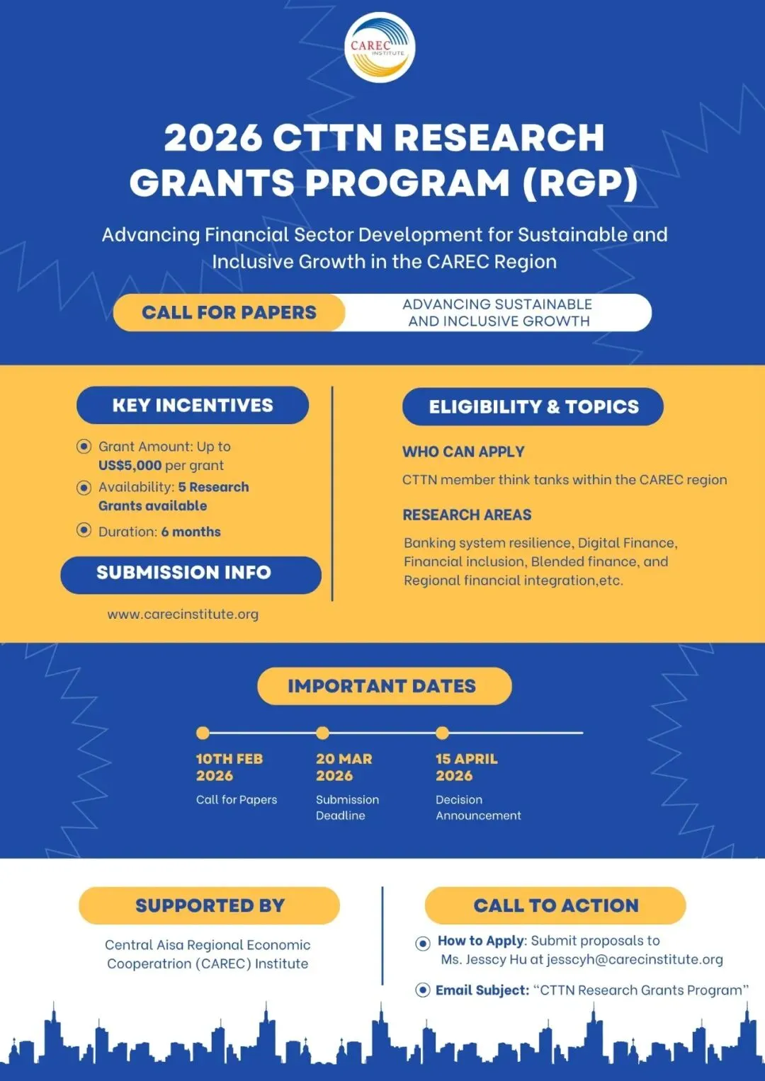 请将您的提案发送至电子邮箱jesscyh@carecinstitute.org,邮件标题请注明“CTTN研究资助项目”。了解更多信息及下载申请表格,请前往中亚区域经济合作学院官网(https://www.carecinstitute.org/)或点击下方“阅读原文”跳转查看征文通知。