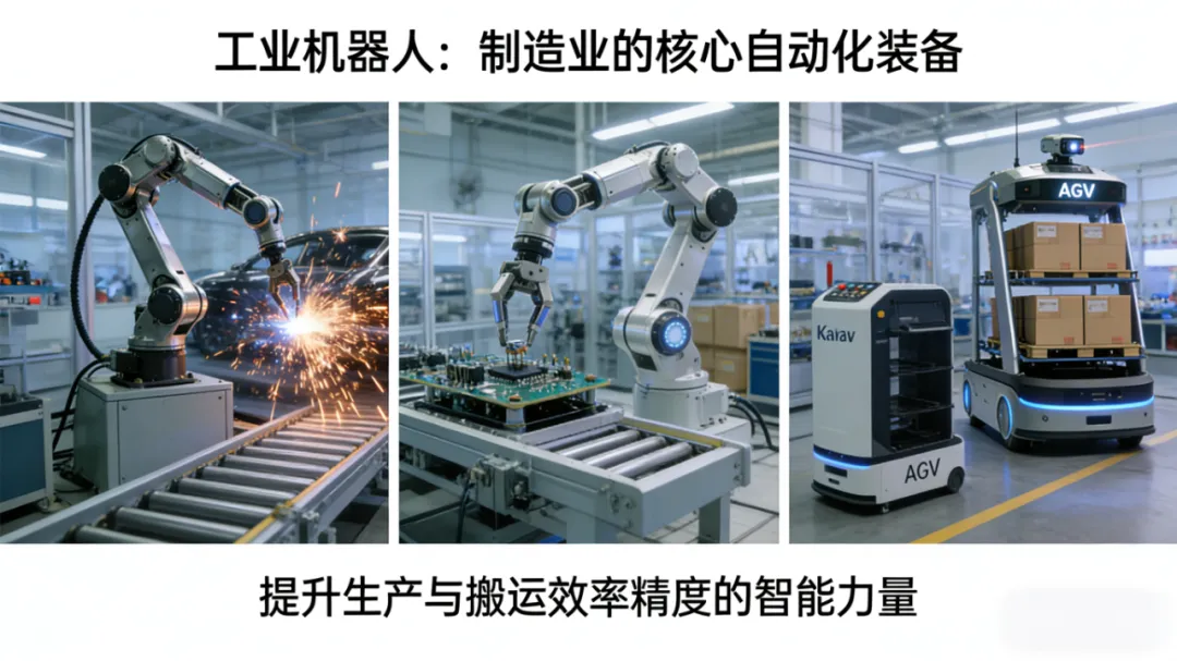 工业机器人作为智能制造的核心装备,正以柔性化、智能化优势深度渗透各工业场景。从汽车行业的焊接、装配、喷涂,到电子产业的精密分拣、芯片封装,再到新能源领域的锂电电芯装配、光伏组件检测,其高效精准的作业能力大幅提升生产效率与产品一致性。在航空航天、船舶制造等高端制造领域,机器人承担起重型部件搬运、复杂结构加工等高危重载任务;在化工、矿山等特殊场景,防爆、防尘型机器人替代人工完成巡检、物料转运,筑牢安全生产防线。如今,随着AI、3D视觉、数字孪生技术的融合应用,工业机器人已从单一重复作业向多任务协同、复杂环境适配演进,成为企业降本增效、产业转型升级的关键支撑,持续拓宽工业自动化的边界。