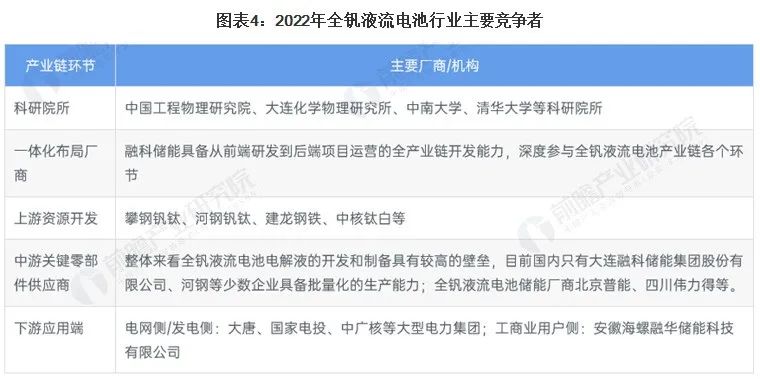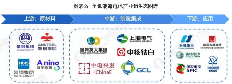 全钒液流电池的上游资源开发、生产、提炼企业主要有钒钛股份、攀钢集团、河钢集团、安宁股份等;中游是电堆、电解液、隔膜厂商有国网英大、上海电气、中电兴发等公司;下游储能集团包括华电集团、大唐集团、国家电网等。
