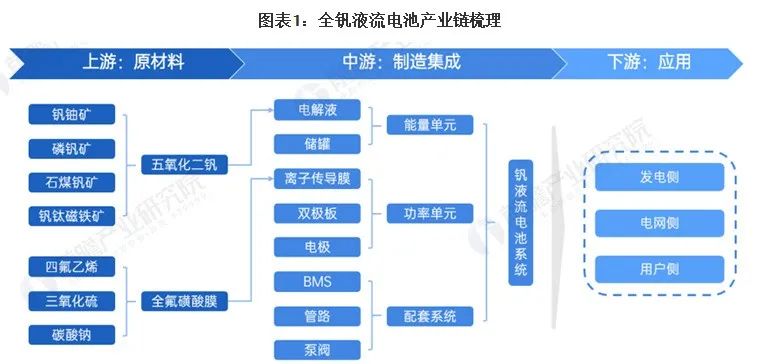 全钒液流电池产业链上游主要涉及钒资源的开采与冶炼,中游则进行全钒液流电池储能系统的设计与制造,包括功率单元(电堆)与能量单元(电解液)两大部分,下游主要负责储能项目的开发和运营。由于下游储能市场可选择技术路径较多,且当前电化学储能主力仍为锂离子电池,全钒液流电池的增长目前对下游影响较小,产业变化主要集中在上游和中游。