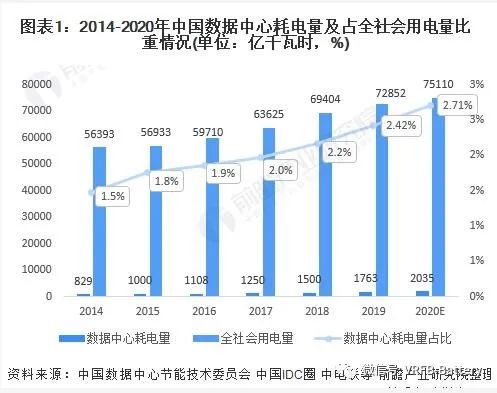 在数据中心产业从诞生到发展的十多年时间里,我国数据中心行业的总耗电量以每年超过10%的速度递增。统计数据显示,2020年我国数据中心总耗电量达到了2000亿千瓦,占比2.71%。2021年,数据再次提升,单以中国电信一家公司为例,2021年数据中心耗电达到56亿千瓦,占总耗电量的20%。预计到2025年,占比将增加一倍,达到4.05%。妥妥的“能耗大户”。