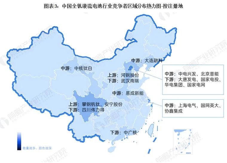 根据区域热力图,我国全钒液流电池行业产业链上企业相对分散,其中,上游企业主要布局在钒资源较为丰富的地区,如四川、河北等地区;下游电网、发电企业主要集中于北京。