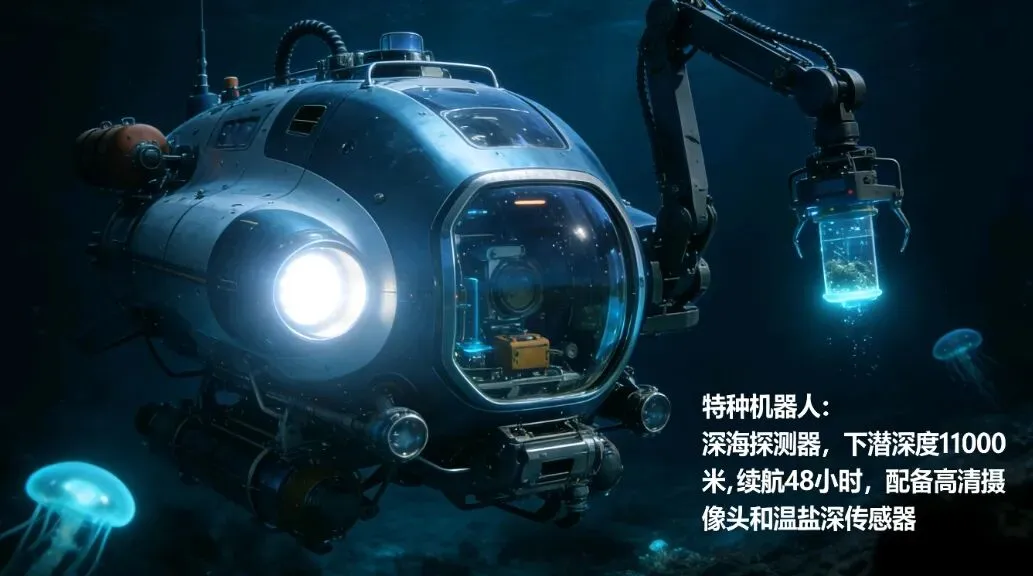 深远探测领域突破空间限制:深海机器人下潜深度达11000米,耐压壳体可抵御110MPa水压,机械采样臂成功获取热液生物群落样本;极地科考机器人配备低温电池(-40℃正常工作),自主导航冰盖裂缝区域,绘制三维地形图谱。此外,特种机器人还在矿山开采(隧道掘进)、太空探索(舱外维护)、公共安全(排爆安检)等场景形成标准化解决方案,推动行业向“无人化、智能化、安全化”转型。