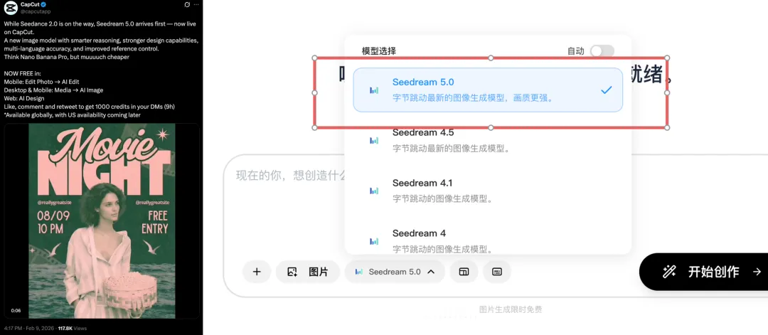 2026 年 2 月 10 日,字节跳动正式推出全新图像生成模型 Seedream 5.0,该模型已落地剪映、剪映海外版 Capcut、字节 AI 创作平台小云雀,在即梦 AI 平台开启灰度测试,图片生成服务同步开启限时免费体验,美国地区将后续上线。新模型对标 Nano Banana Pro,且使用成本更低,目前所有用户可免费使用 20 次,Capcut 还推出互动赠积分活动,进一步降低用户体验门槛。