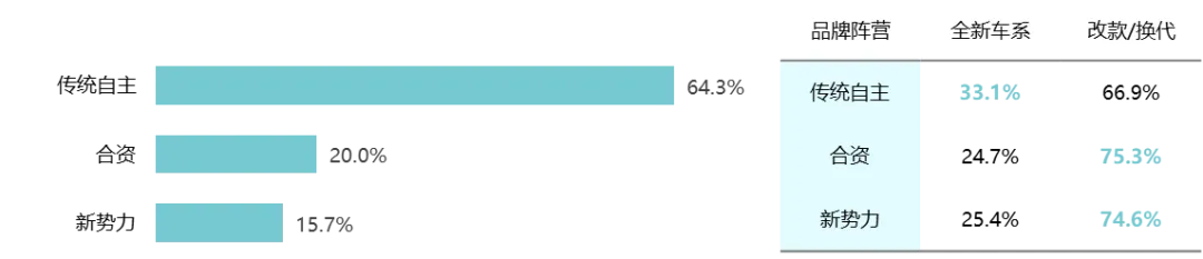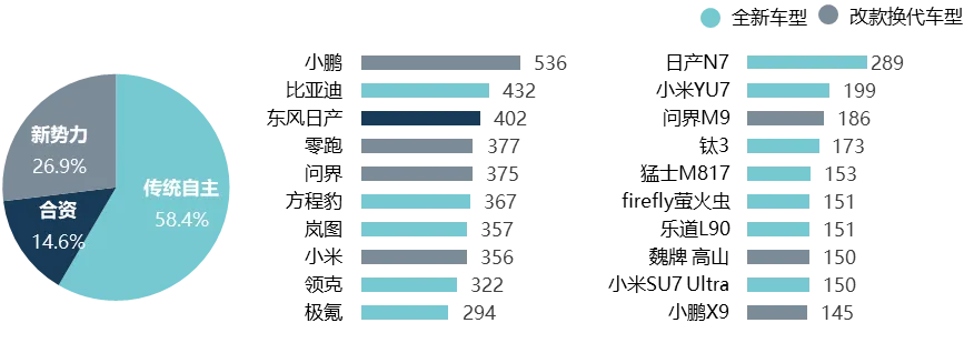 从品牌阵营来看,传统自主品牌是市场供给端绝对主力,其新车发布总量占据三分之二份额,且全新车系的占比更为显著。新势力品牌推新节奏更为聚焦,将有限资源集中于关键战略车型,力求打造引爆市场的“爆款”产品。