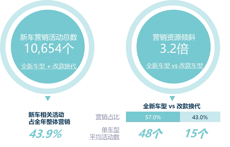 从营销投入强度来看,全新车单车型平均开展48个活动,是改款新车的3.2倍,营销策略呈现“集中火力”式聚焦发力,核心目标是在新车上市初期快速打响声量,抢占用户心智。
