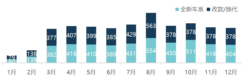2025年全新车共举办新车发布会229场,占全年总场次的54.3%,全新车占据大部分营销资源。4月和8月是发布会高峰,与全新车上市节奏高度契合。