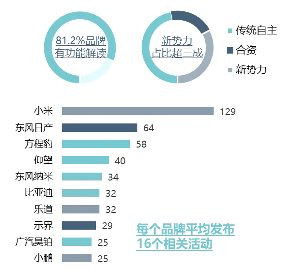 营销活动概况:产品功能解读是新车营销标配,新势力投入突出,小米表现亮眼
