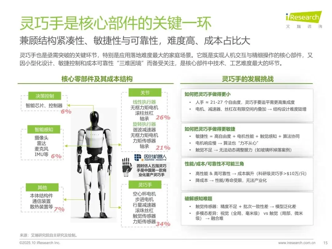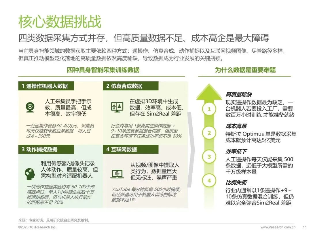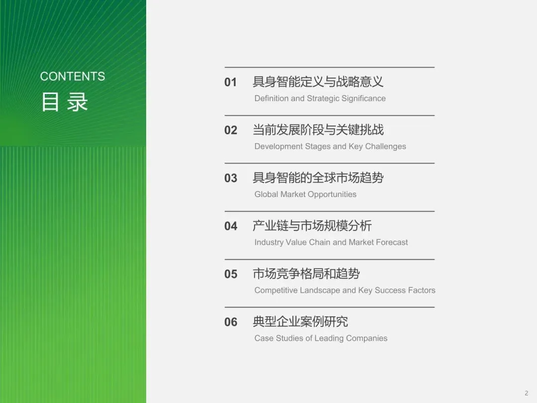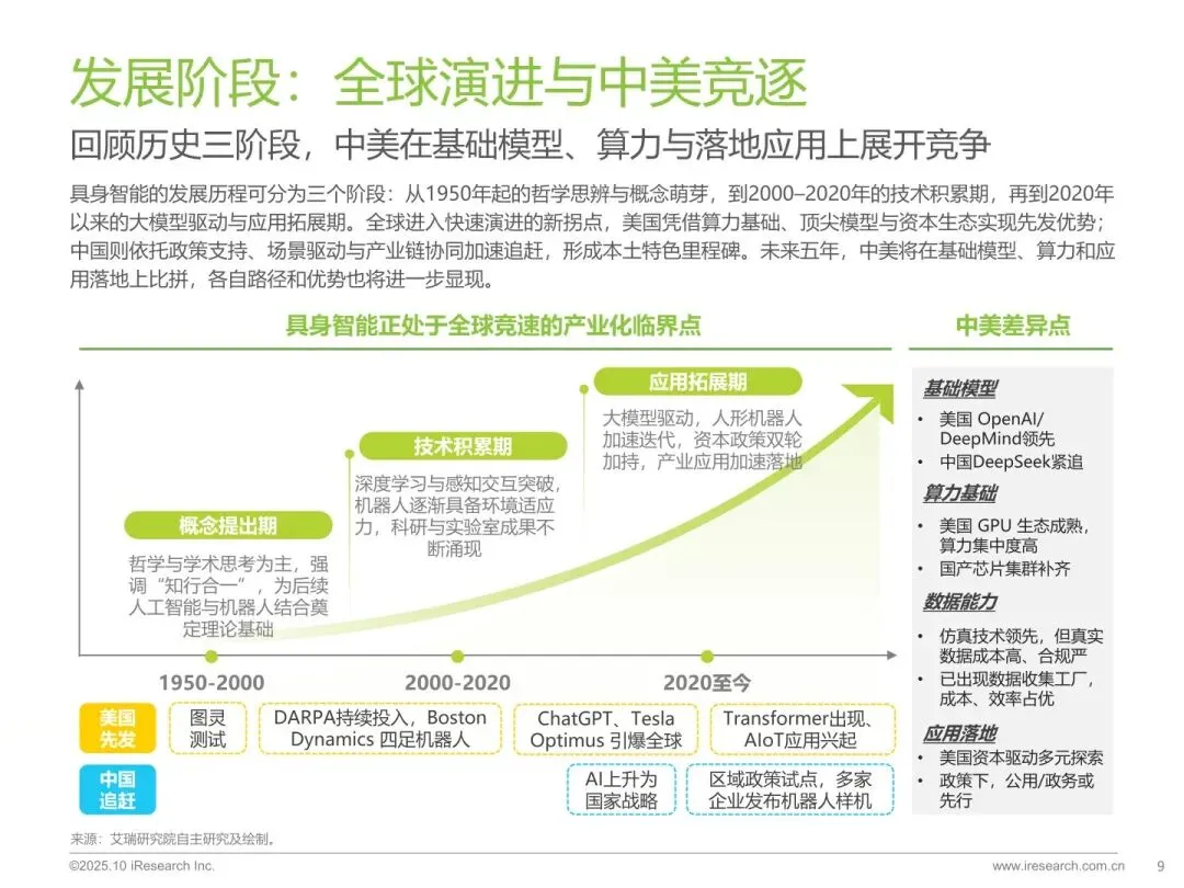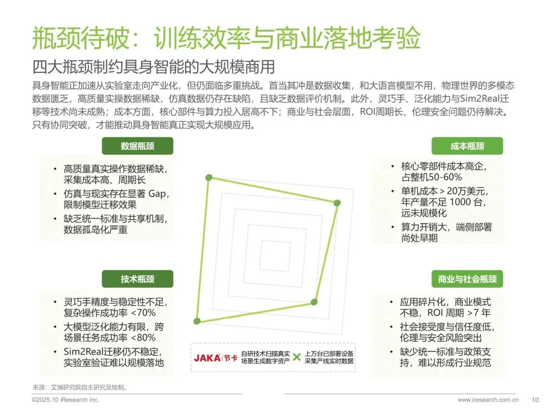:具身智能是智能体依托物理身体,通过感知 - 理解 - 决策 - 行动闭环与环境强交互的人工智能形态,是实现通用人工智能的重要路径。其发展有助于推动芯片、传感器、大模型等产业链协同创新,带动多行业智能化转型,是中美科技竞争的关键领域,中国将其上升为国家战略。 - 行业处于产业化临界点,技术瓶颈待突破