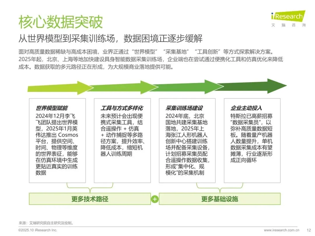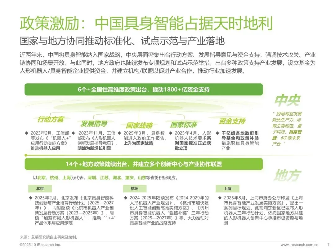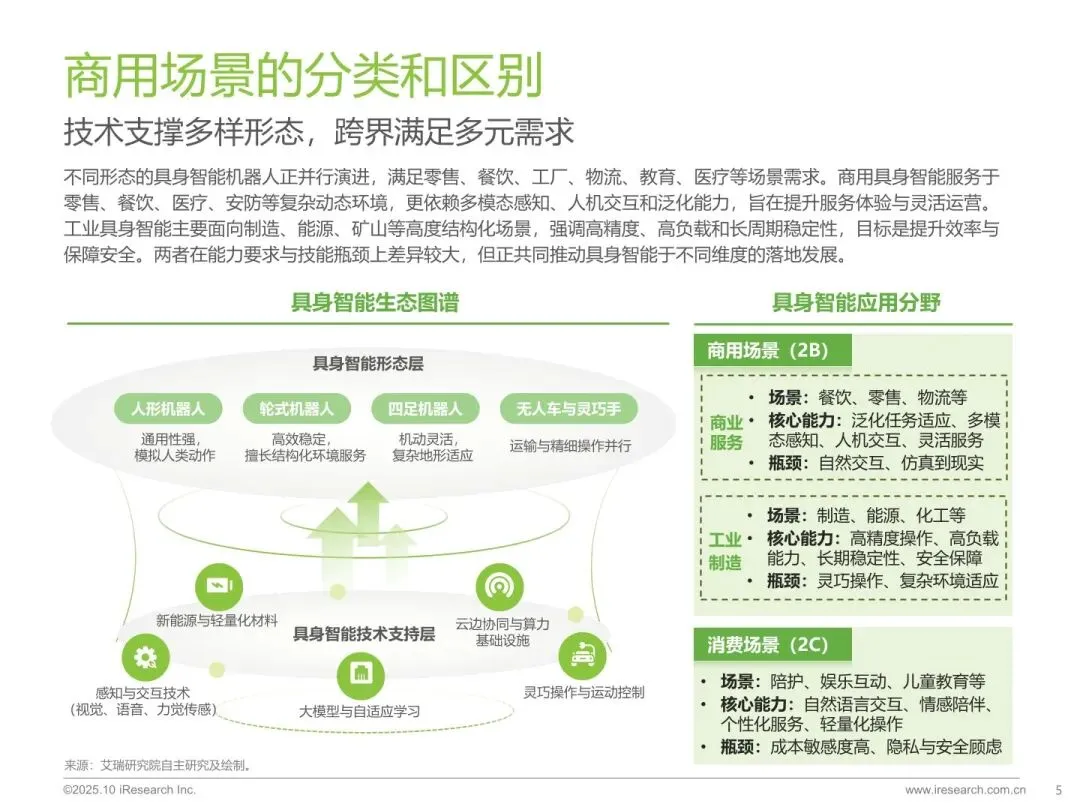 报告由艾瑞研究院于 2025 年 10 月发布,界定具身智能的定义与核心特征,分析其在商用、工业、消费场景的应用差异与战略意义。梳理行业发展阶段、技术瓶颈与政策支持,预测全球及中国市场规模,剖析竞争格局与典型企业案例,展望商业化落地与全球化趋势。