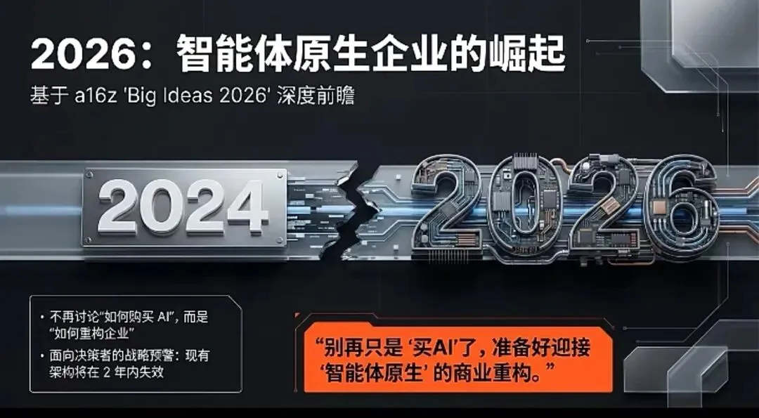 2026年,时间窗口正在收紧。智能体原生不是“可选项”,而是数字时代的“生存前提”。这场转型并非简单的技术升级,而是一场涉及战略、架构、数据、评估乃至企业文化的系统性重构。其核心是从“以人类为中心设计流程”转变为“以智能体为核心重构业务”。企业必须在未来18个月内,完成思维切换、架构准备和初步实践,方能在智能体原生的新文明中,占据一席之地。