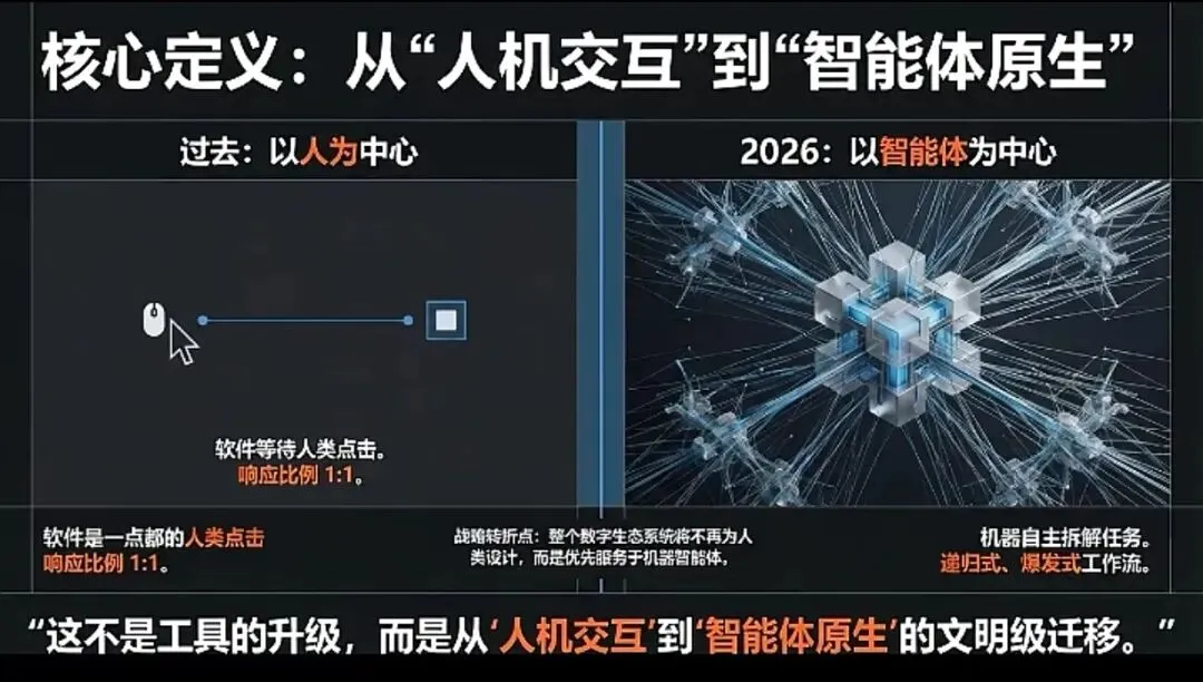 我们正站在一个文明级跃迁的关口。过去四十年的信息化、数字化,本质是“为人类适配机器”;而未来十年的智能化,核心是“为机器(智能体)重构世界”。2026年,企业竞争的基础范式已从“人机交互”彻底转向“智能体原生”。智能体不再是辅助工具,而是企业的“数字员工”、“核心生产力”与“新业务接口”。任何未能在此后18个月内完成从“为人类设计”到“为智能体构建”这一根本性范式转换的组织,将面临的不只是竞争失利,而是整个技术架构与商业逻辑的淘汰。