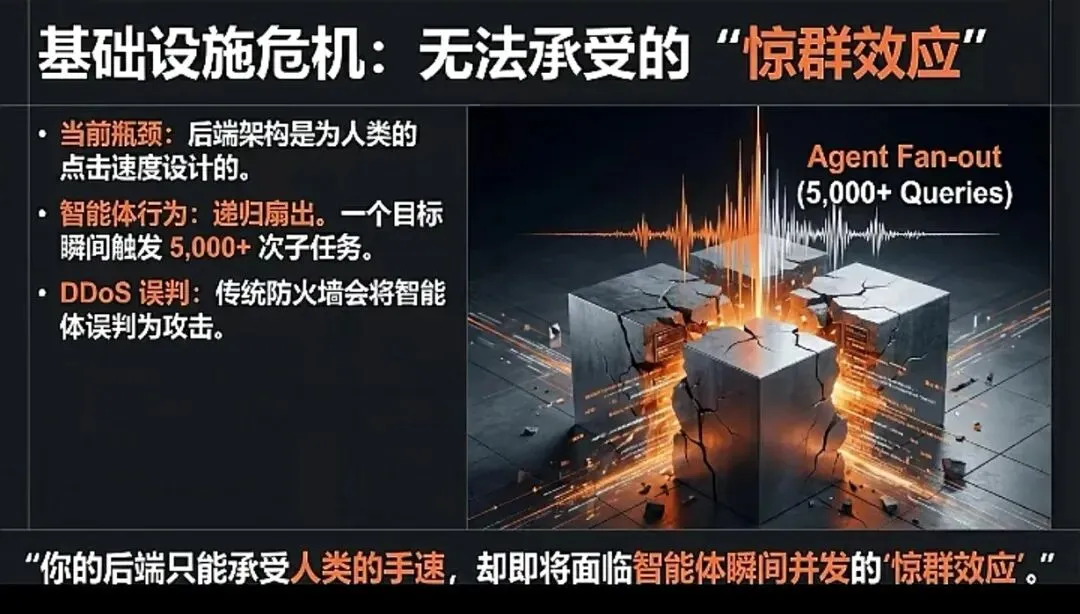 传统IT基础设施是为人类流量设计的。人类点击频次以秒计,而一个智能体的决策可能触发瞬时数千个API调用与数据请求。当前绝大多数企业的中间件、数据库连接池和防火墙,会将这种合法的、高并发的智能体行为误判为DDoS攻击而直接拦截,导致业务瞬间瘫痪。我们称之为“智能体惊群效应”。企业的基础架构,必须从承受“江河流量”升级为承受“海啸级流量”。