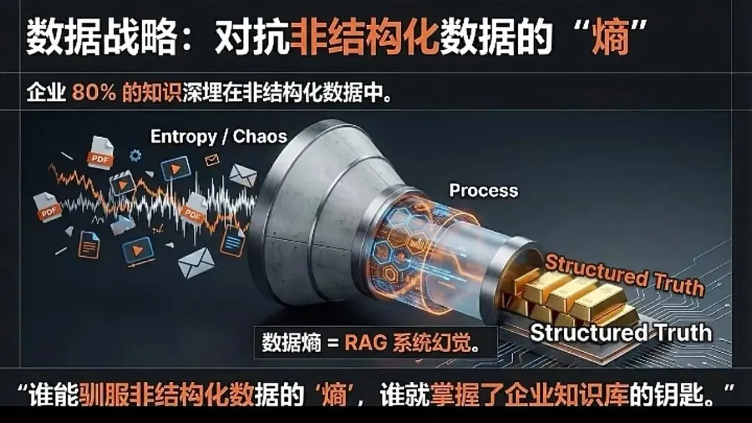 | 80%知识埋没于PDF、邮件等非结构化数据中 | 建立抗“熵”数据治理体系,持续将非结构化数据转化为结构化、高保真知识单元。 |