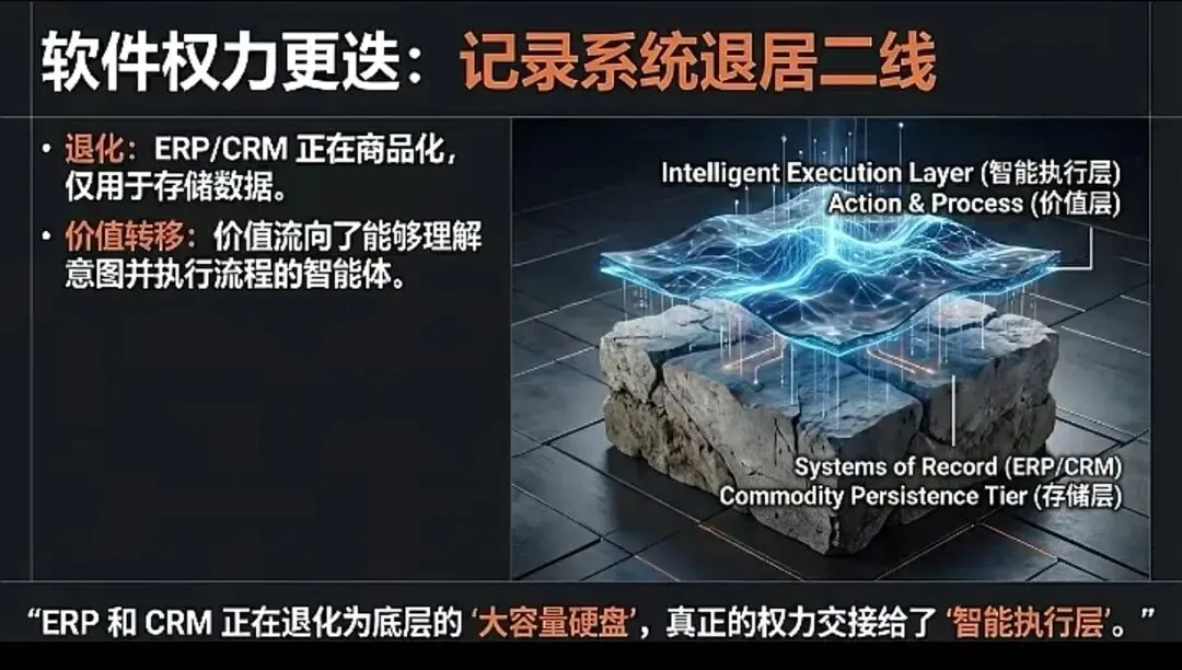 - 文明级跃迁:从“人机交互”到“智能体原生”,意味着企业价值创造的核心逻辑发生改变。过去,所有系统(ERP、CRM、OA)围绕人类的理解速度(阅读、点击、审批)设计。未来,系统的核心服务对象是自主智能体,其思考与执行速度是人类的数千倍。企业价值的重心,正从“记录与流程管控”(传统软件层),不可逆地转向“感知、决策与执行”(智能体层)。