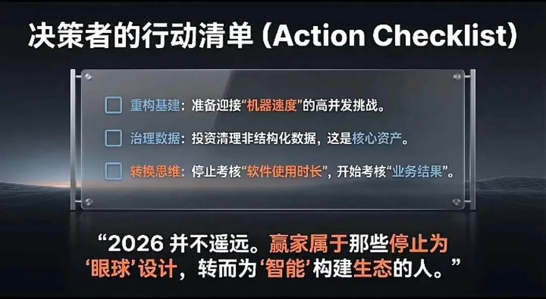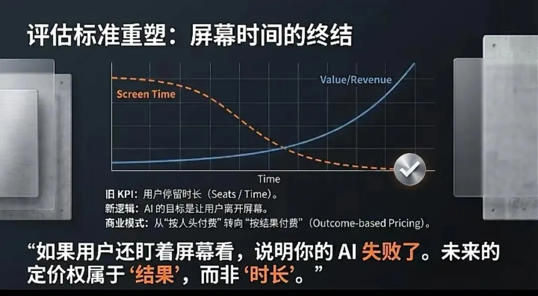 - 评估逻辑:考核的不再是“有没有人用”,而是“事情有没有被最快、最好地办成”。智能体的高效,恰恰体现在它的“隐身”与“瞬时”。