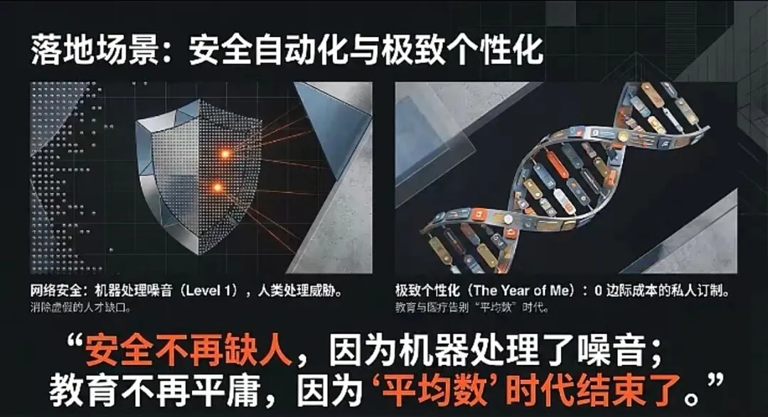 - 教育与医疗:终结“平均数”时代。教育智能体可以为每个学生提供个性化的学习路径;医疗智能体可结合基因组学、蛋白质组学和实时生理数据,提供零边际成本的个性化健康管理方案。规模化的个性定制成为可能。