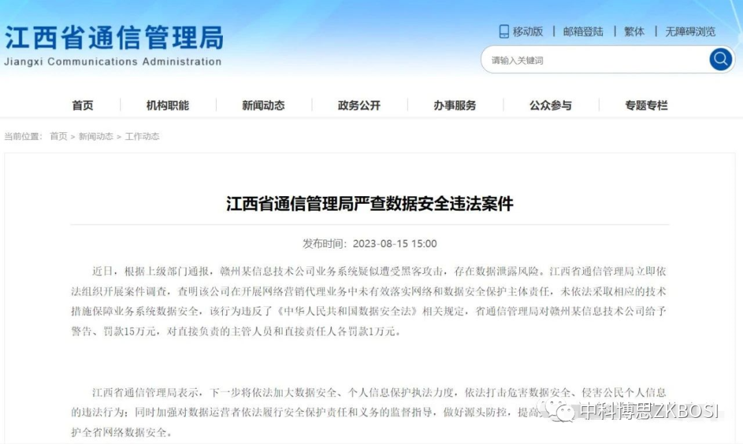 | 2023年8月15日,近日,根据上级部门通报,赣州某信息技术公司业务系统疑似遭受黑客攻击,存在数据泄露风险。江西省通信管理局立即依法组织开展案件调查,查明该公司在开展网络营销代理业务中未有效落实网络和数据安全保护主体责任,未依法采取相应的技术措施保障业务系统数据安全,该行为违反了《中华人民共和国数据安全法》相关规定,省通信管理局对赣州某信息技术公司给予警告、罚款15万元,对直接负责的主管人员和直接责任人各罚款1万元。 |