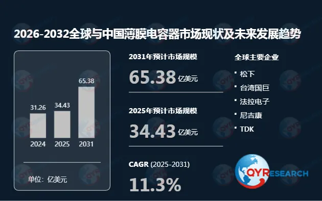 根据QYR(恒州博智)的统计及预测,2025年全球薄膜电容器市场销售额达到了34.43亿美元,预计2031年将达到65.38亿美元,年复合增长率(CAGR)为11.3%(2025-2031)。