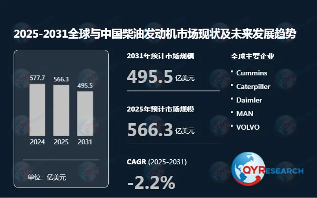 根据QYR(恒州博智)的统计及预测,2025年全球柴油发动机市场销售额达到了566.3亿美元,预计2031年将达到495.5亿美元,年复合增长率(CAGR)为-2.2%(2025-2031)。
