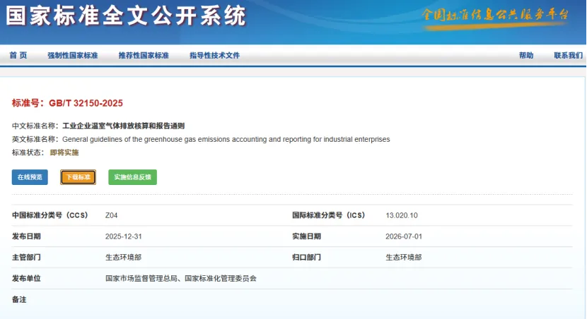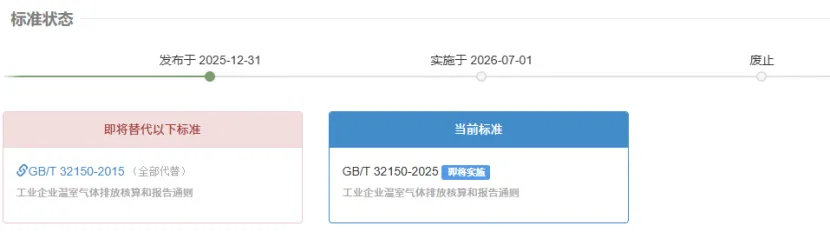 2025年12月31日,国家标准《工业企业温室气体排放核算和报告通则》GB/T 32150-2025发布,将于2026年7月1日实施,届时全部替代GB/T 32150-2015标准。由TC548(全国碳排放管理标准化技术委员会)归口 ,主管部门为生态环境部。