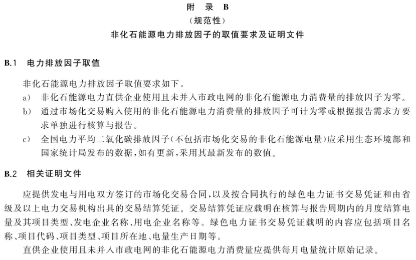 标准原文:增加了报告主体使用外购非化石能源电力排放因子确定的要求;增加了报告主体使用外购非化石能源热力排放因子的选取要求;增加了非化石能源电力排放因子的取值要求及证明文件(附录B)。