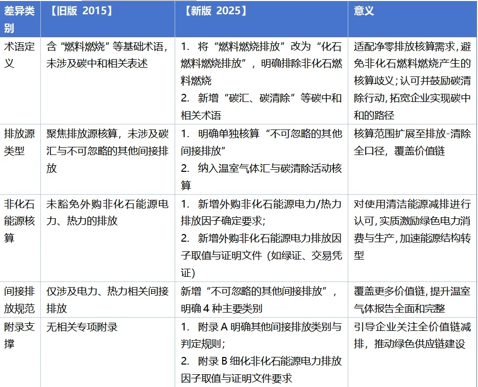 【旧版 2015】使用“燃料燃烧排放”这一统称;未提及温室气体清除相关内容。【新版 2025】将“燃料燃烧排放”更改为“化石燃料燃烧排放”,将生物质等化石燃料燃烧排除在外,解决原有术语界定模糊导致的核算偏差问题;引入了“温室气体汇”“温室气体清除”等术语,完善碳中和相关术语体系,为企业净零排放提供依据和激励。