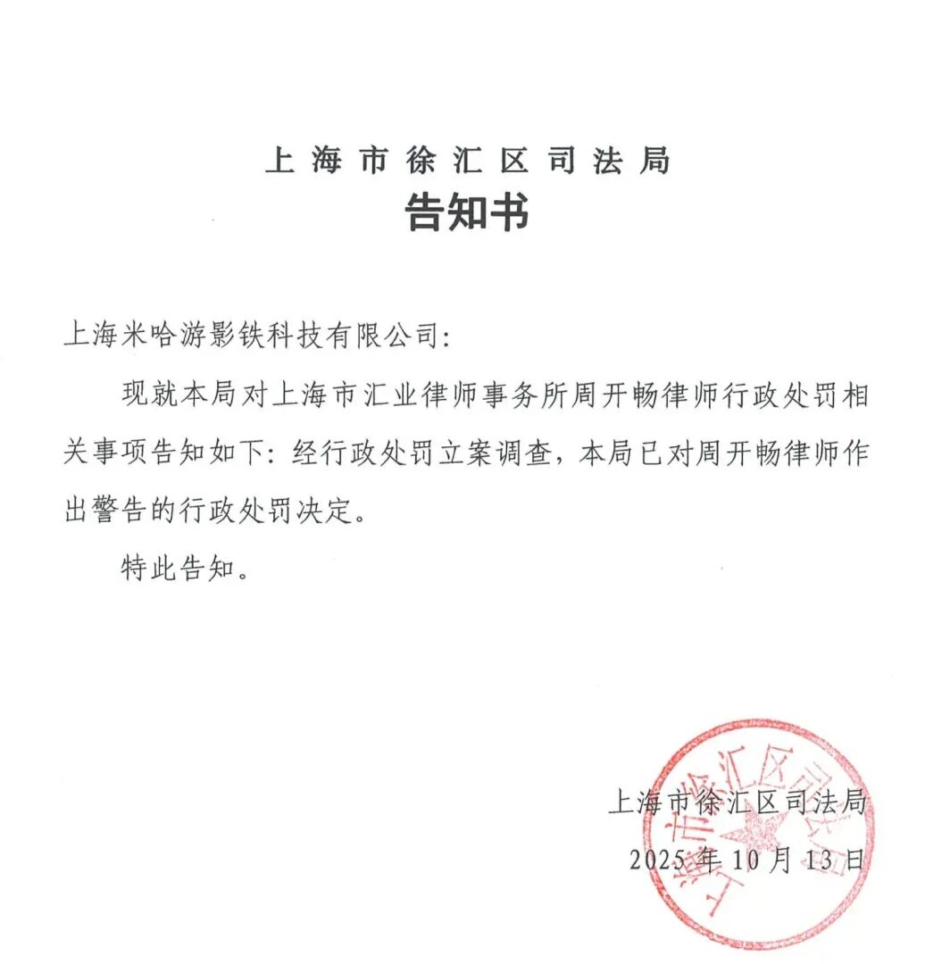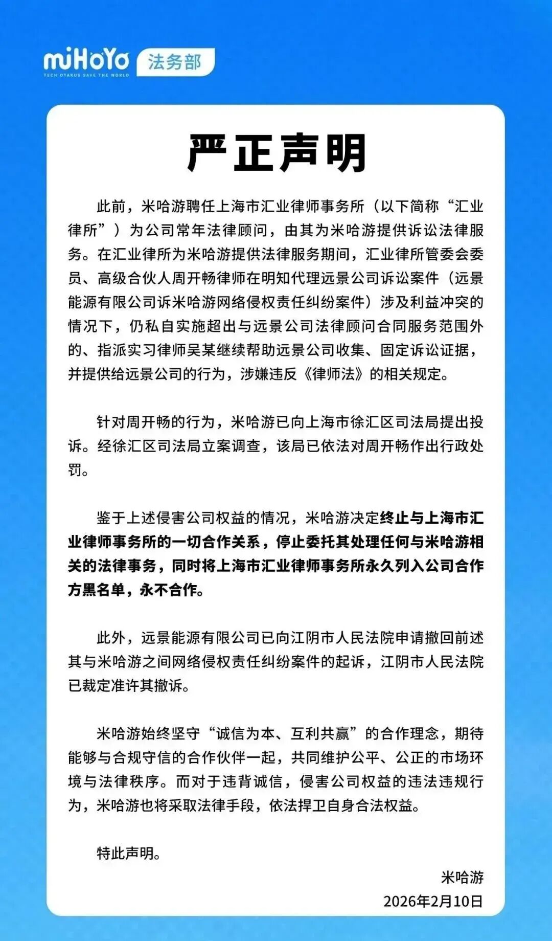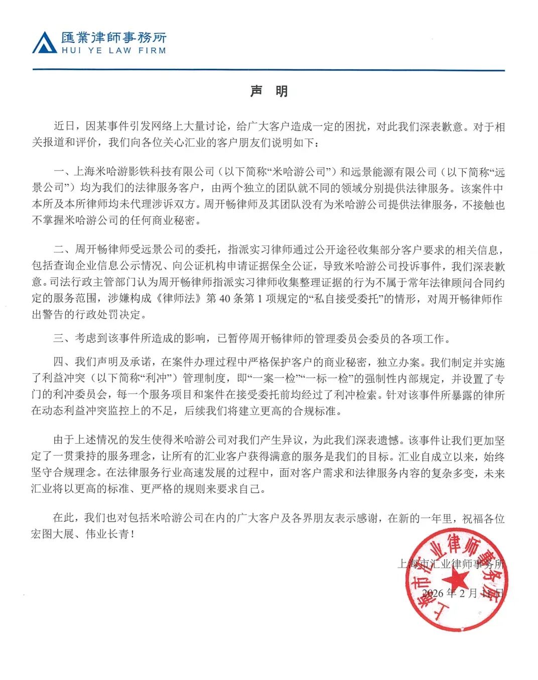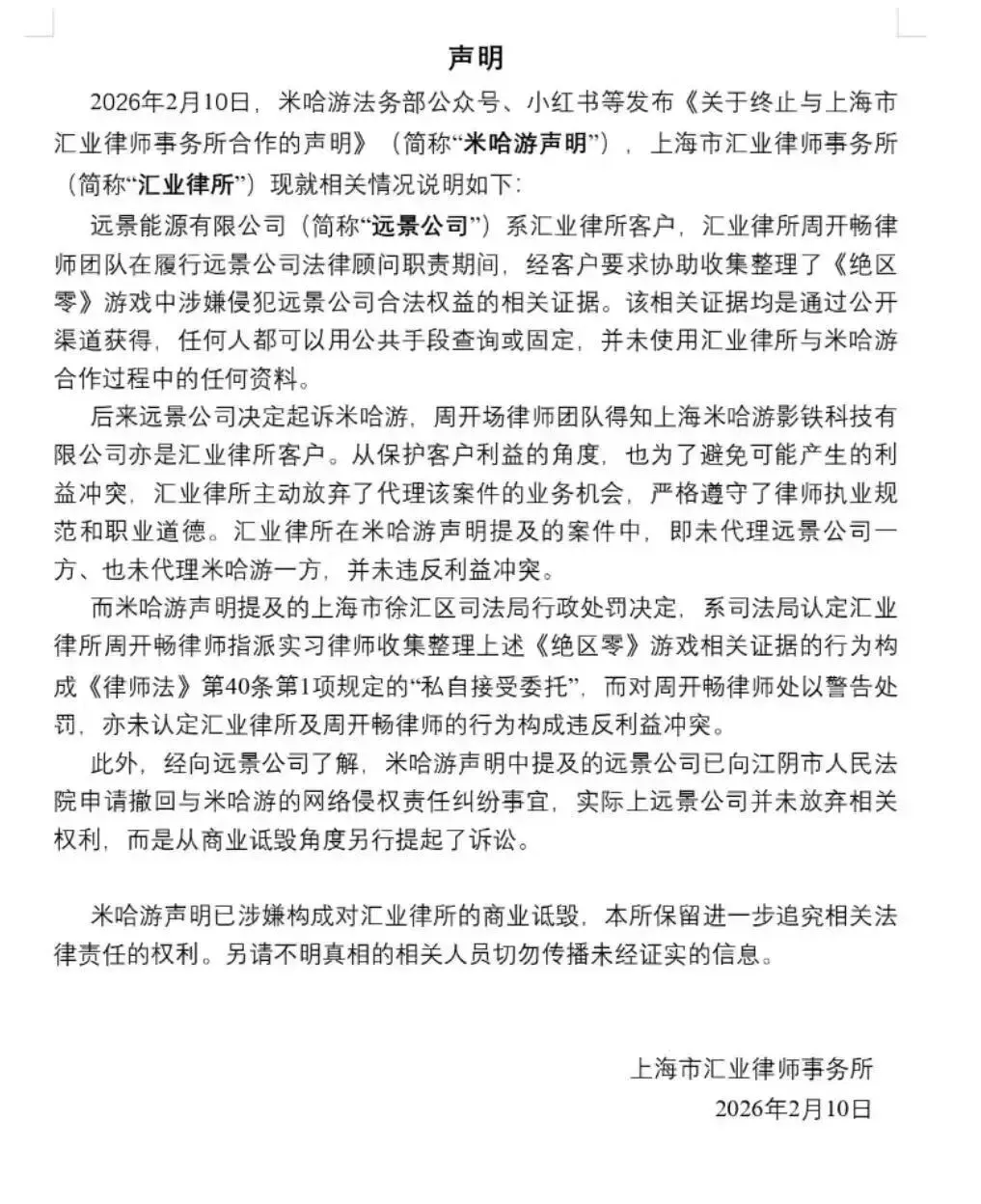 结合各方的陈述以及我从公开渠道了解到的信息,整个事件的大致脉络如下:米哈游和远景公司都是汇业所的客户,由A律师团队和周律师团队分别提供法律服务。后来,远景公司认为米哈游侵犯了其合法权益,拟起诉远景公司,周律师指派团队实习律师协助远景公司搜集固定了相关证据,包括查询企业信息公示情况、向公证机构申请证据保全公证。之后,远景公司拿着这些证据,以网络侵权责任纠纷为由,向法院起诉了米哈游。虽然该案原被告均不是由汇业所律师代理,但在诉讼过程中,米哈游发现远景公司提供的证据材料里竟然有自己的常法汇业所的“工作成果”。至于米哈游是怎么发现的,据传有可能是律师助理在取证时留下了自己的个人信息或者邮箱,远景公司向法院提交时没有脱密处理。虽然后续远景公司撤回了对米哈游的起诉。但米哈游认为汇业所吃里扒外、竟然背后给对手递刀子,于是向司法局投诉了汇业所。最终,2025年10月13日,上海市徐汇区司法局调查认为,周律师指派实习律师收集证据的行为不属于与远景公司常年法律顾问合同约定的服务范围,涉嫌构成《律师法》第40条第1项规定的“私自接受委托”的情形,对周律师作出的警告的行政处罚决定。从上述情况来看,其实司法局早在去年10月份就已经对这起事件作出了处理,而米哈游却在时隔快4月之后公开发布声明,对汇业所进行谴责,甚至声称要将汇业所拉入黑名单、永不合作。其中的原由,不是很清楚。有可能是米哈游认为司法局处理太轻,也可能是为了警示其合作的其他律所。根据网上的信息,在远景公司撤回对米哈游的起诉之后,米哈游又反过来以商业诋毁纠纷起诉了远景公司。更刺激的是,根据网传的一份没有盖章的汇业所声明,远景公司在撤诉后也从商业诋毁角度另行提起了诉讼。同时,据小道消息,事发后,米哈游找到周律师,但周律师的态度很强硬,觉得自己没有违规,于是双方越闹越僵。结合这一点,也许就不难理解米哈游为什么现在发布公开声明,因为米哈游和远景公司之间的纠纷还在继续,而米哈游认为,汇业所周律师团队是远景公司背后实际的军师。声明的发布,意在给远景公司及其背后的周律师施压。中国规模化律所的利冲困局