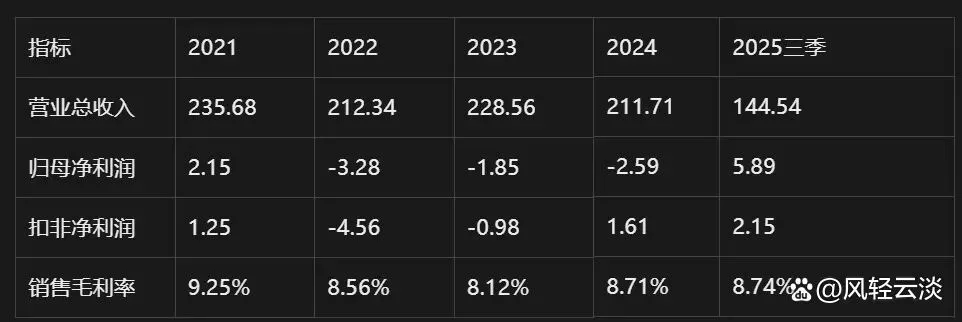 核心:2025年扭亏,但盈利质量差(投资收益占比超60%),整体毛利率偏低(8%-9%)。