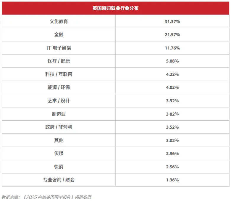 以英国海归为例,文化教育行业是他们就职的第一大选择,占比31.37%。英国在教育学、语言学、跨文化研究等领域的学科实力突出,大量留学生可能攻读相关专业,毕业后进入国际学校、留学机构、语言培训等领域具备天然优势。其次是金融行业,占比21.57%。排名第三的是IT电子通信,占比11.76%。