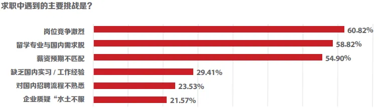 尽管海归就业形势整体向好,但求职过程中仍面临诸多挑战。以英国海归为例,超半数的受访者认为岗位竞争激烈及留学专业与国内需求脱节是求职时最大的挑战。