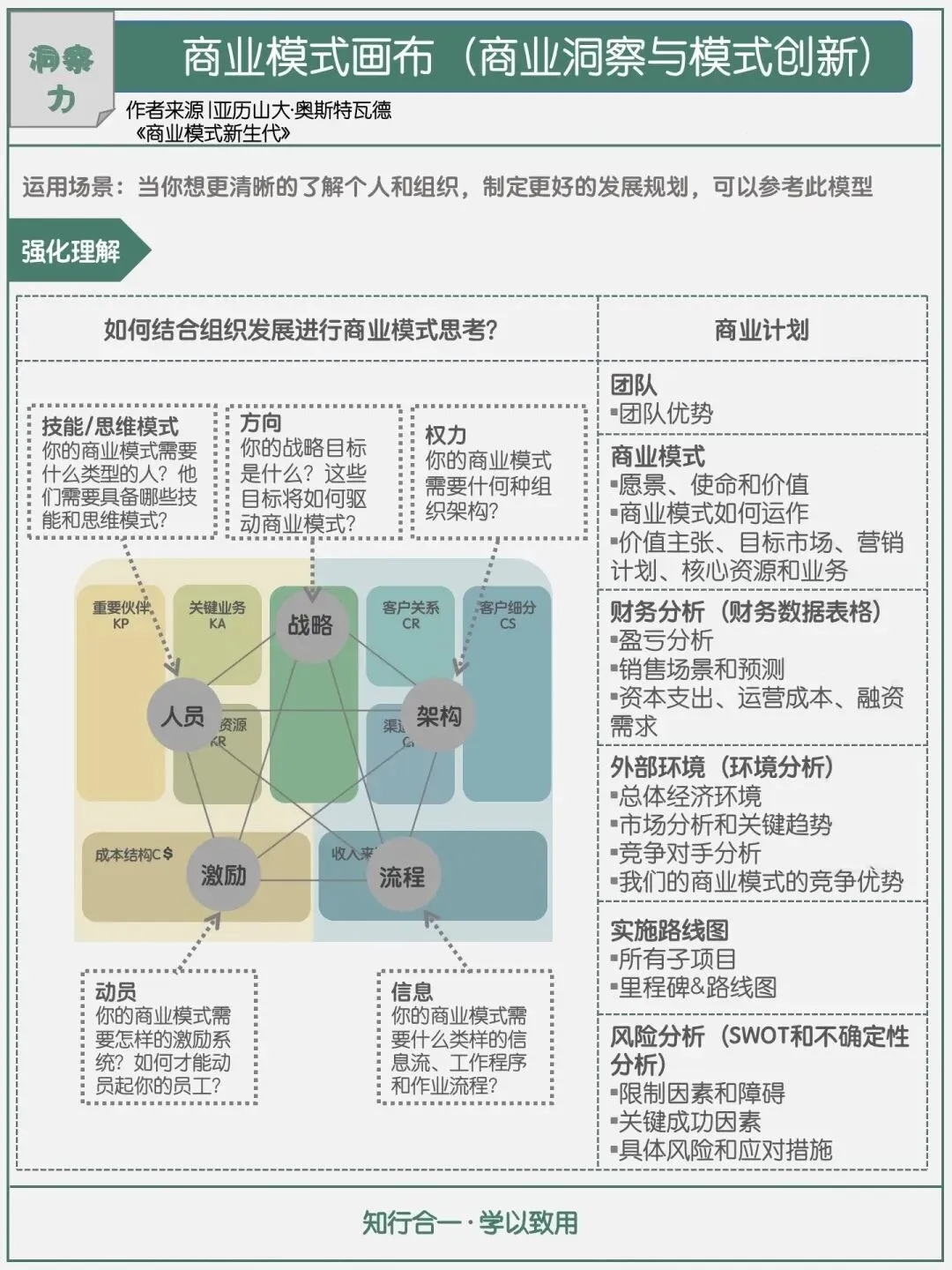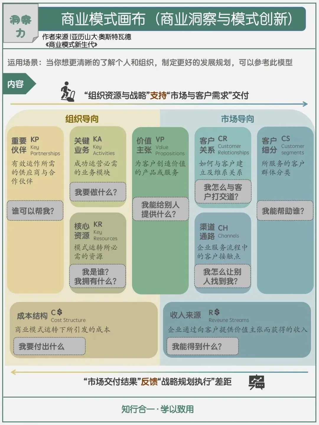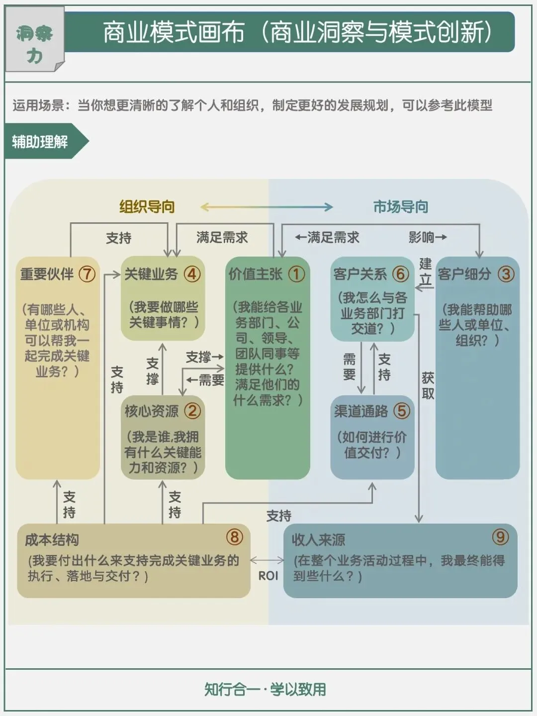在商业计划制定中,也可以通过两个方向分析应用。从组织导向思考,以自身为核心:我有什么价值、付出什么传递价值、传递价值后能获得什么收益,再用收益反哺成本投入,形成闭环。从市场导向思考,贴合市场需求:市场需要什么、我是否拥有对应的资源、如何获取缺失的资源、该如何执行行动、最终能收获什么,核算投入产出比后,再开展新一轮的商业模式优化与创新。