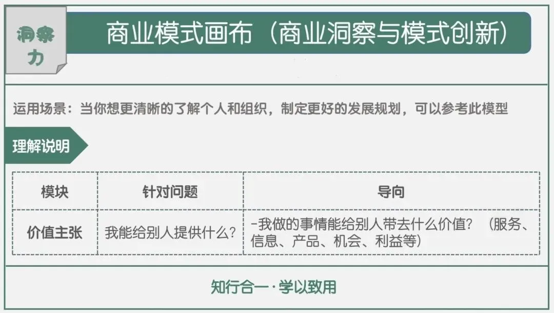 价值主张是整个模式的核心,核心思考的是我能为别人提供什么价值。简单来说,就是明确自己能帮他人解决什么问题、满足什么需求,无论是商业服务还是个人工作,只有找准价值点,后续的所有行动才有意义。