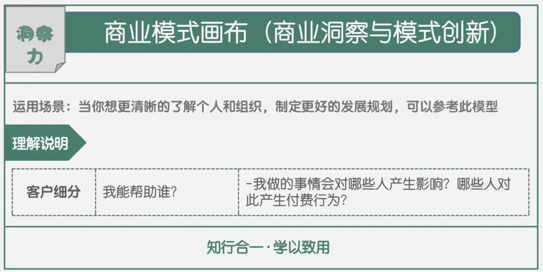 客户细分是找准服务对象,思考我做的事情能影响到哪些人、哪些人会为此付费。明确目标人群,才能精准发力,避免盲目行动,不管是商业业务还是个人工作,找准服务对象是高效推进的关键。