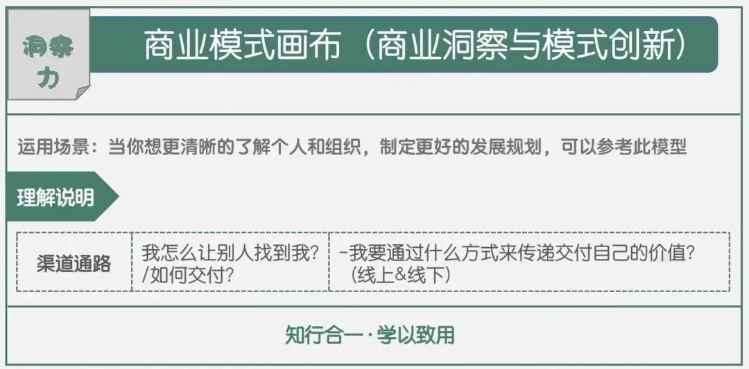 这个模块思考价值传递的路径,即通过哪些渠道传递价值、交付服务,如何宣传自己,让需要的人找到自己。打通渠道通路,才能让自身的价值被目标人群看见、认可,实现价值的有效传递。