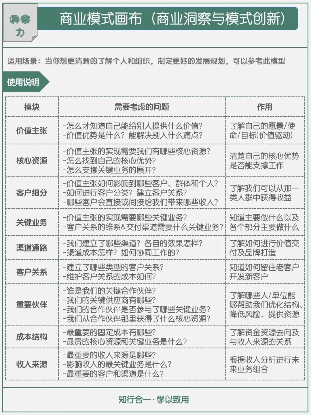 整体来看,商业模式画布的核心逻辑可以总结为五个简单的问题:我想做什么、我有什么、我能给别人提供什么、怎么提供、如何收益,形成了完整的闭环思维。