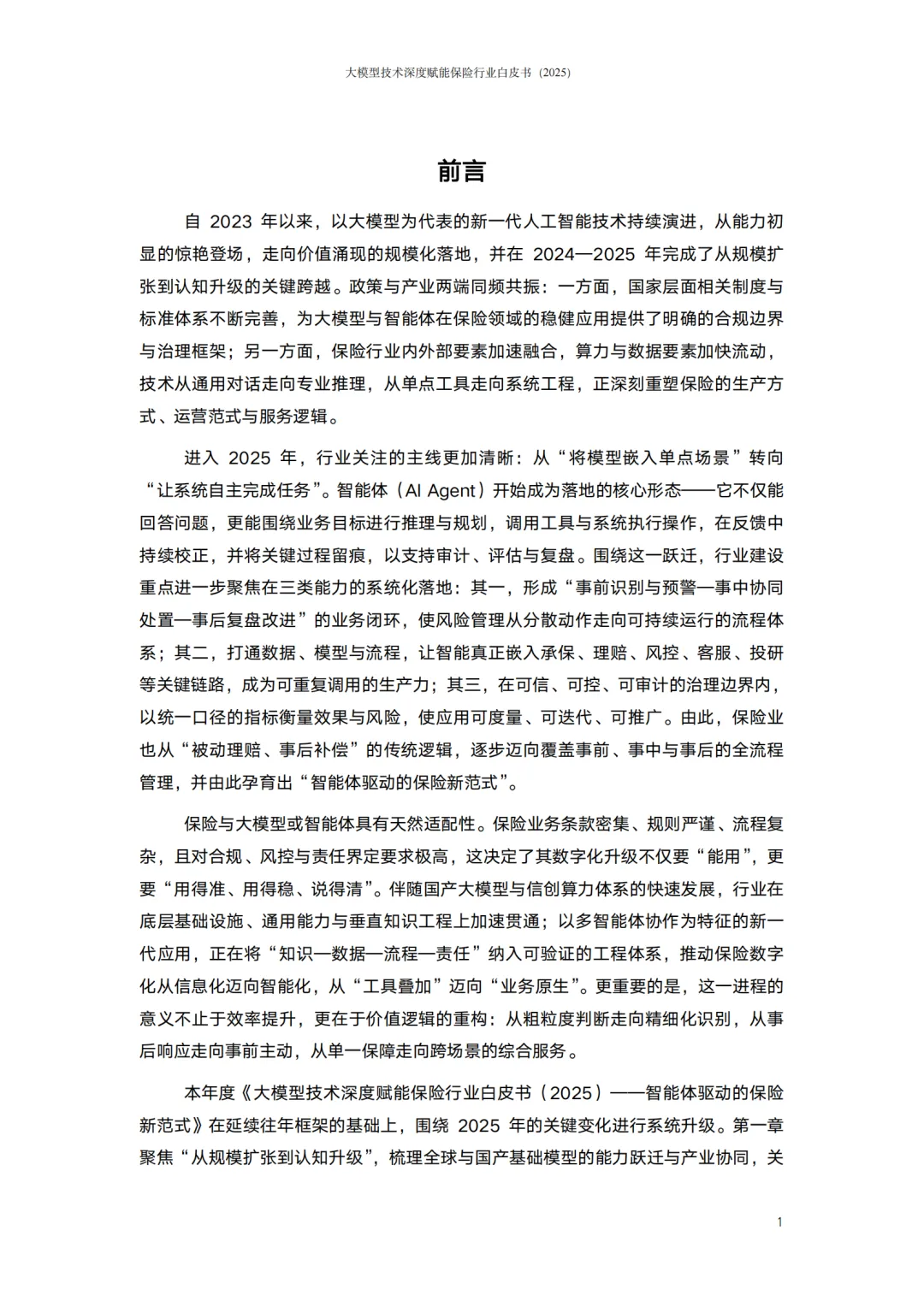 2023 年以来,以大模型为代表的新一代人工智能技术持续演进,2024-2025 年完成从规模扩张到认知升级的关键跨越,智能体(AI Agent)成为保险行业落地核心形态,推动行业从 “被动理赔、事后补偿” 传统逻辑,迈向覆盖事前、事中与事后的全流程管理,孕育出 “智能体驱动的保险新范式”。