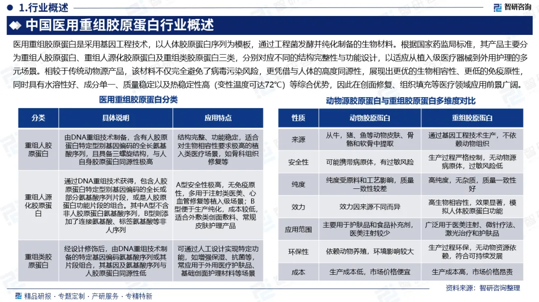 行业概述:医用重组胶原蛋白是采用基因工程技术,以人体胶原蛋白序列为模板,通过工程菌发酵并纯化制备的生物材料。根据国家药监局标准,其产品主要分为重组人胶原蛋白、重组人源化胶原蛋白及重组类胶原蛋白三类,分别对应不同的结构完整性与功能设计,以适应从植入级医疗器械到外用护理的多元场景。相较于传统动物源产品,该材料不仅完全避免了病毒污染风险,更凭借与人体的高度同源性,展现出更优的生物相容性、更低的免疫原性,同时具有水溶性好、成分单一、质量稳定以及热稳定性高(变性温度可达72℃)等综合优势,因此在创面修复、组织填充等医疗领域应用前景广阔。