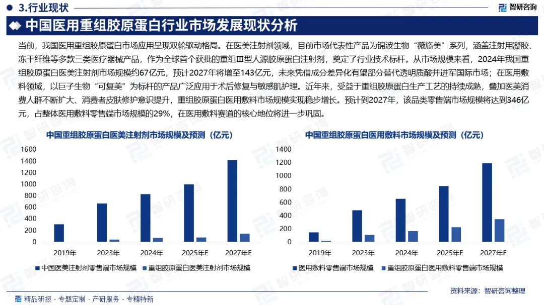 行业市场规模:胶原蛋白作为人体组织器官的核心结构蛋白,占人体蛋白质总量的30%~40%,广泛分布于皮肤、骨骼、软骨等组织中,深度参与人体组织修复与再生过程,是维持机体结构完整性和生理功能的关键物质。重组胶原蛋白依托基因工程技术制备,不仅延续了天然胶原蛋白的生物学功能,更在生物活性、相容性等方面实现优化,成为生物医学与护肤领域的核心材料。从市场规模来看,行业呈现爆发式增长态势。2019-2023年中国胶原蛋白零售端市场规模从168亿元增至584亿元,年复合增长率高达36.5%,预计2027年将突破1937亿元;其中重组胶原蛋白表现尤为突出,2023年市场规模达286亿元,预计2027年将增至1145亿元,2023-2027年复合增速预计达41.4%,而重组Ⅲ型胶原蛋白凭借独特的三螺旋结构优势,已成为研发与应用进展最快的型别之一。
