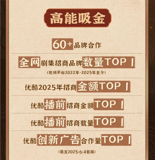 其次,品牌方更喜欢在精品长剧中植入广告,因为通过长时间、沉浸式的叙事,能让观众与角色、故事建立深层情感联系。当品牌在这种情境下自然出现时,观众更容易产生信任和认同,广告效果也更持久,身背60+品牌的《藏海传》便是最好的印证。