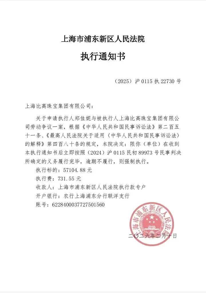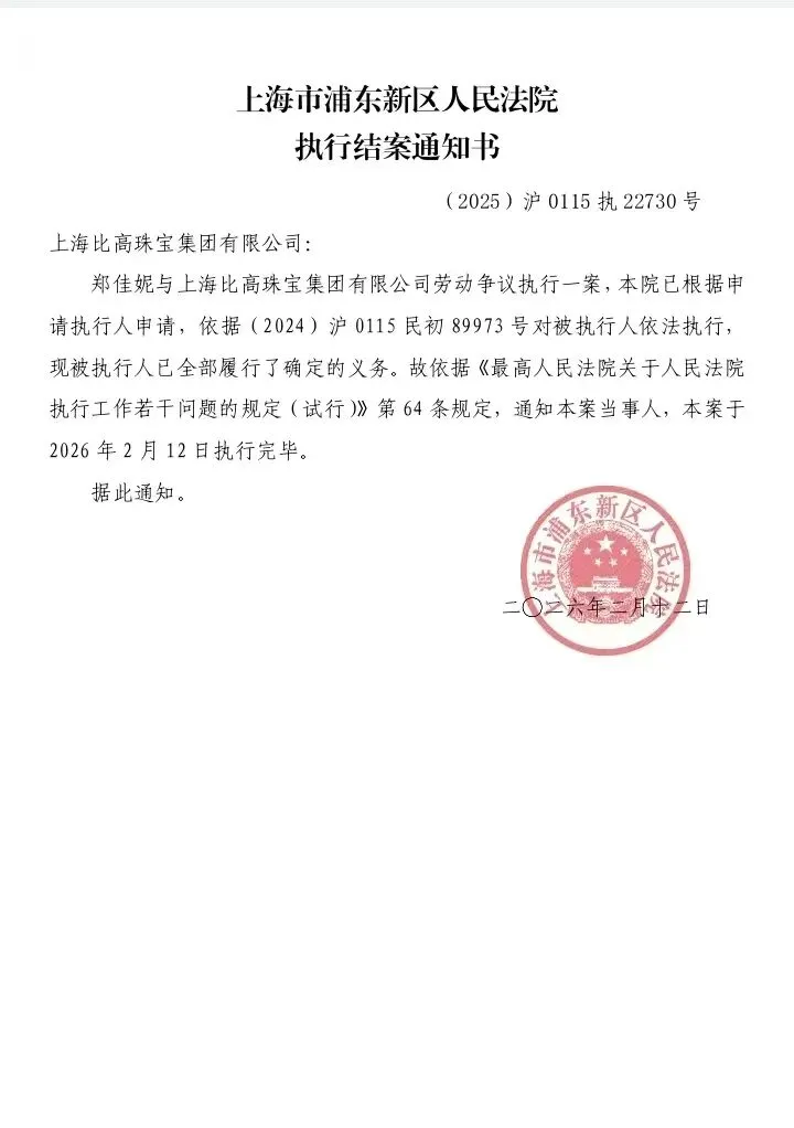 2026年2月我司完成对员工离职劳动仲裁、法院判决执行打款。并对部分劳动者过度维权提起反诉维权,对部分律师委托书缺乏合同要件的虚假意思表示提起侵权赔偿,依法维护上海比高珠宝集团有限公司合法权益及及品牌战略形象。