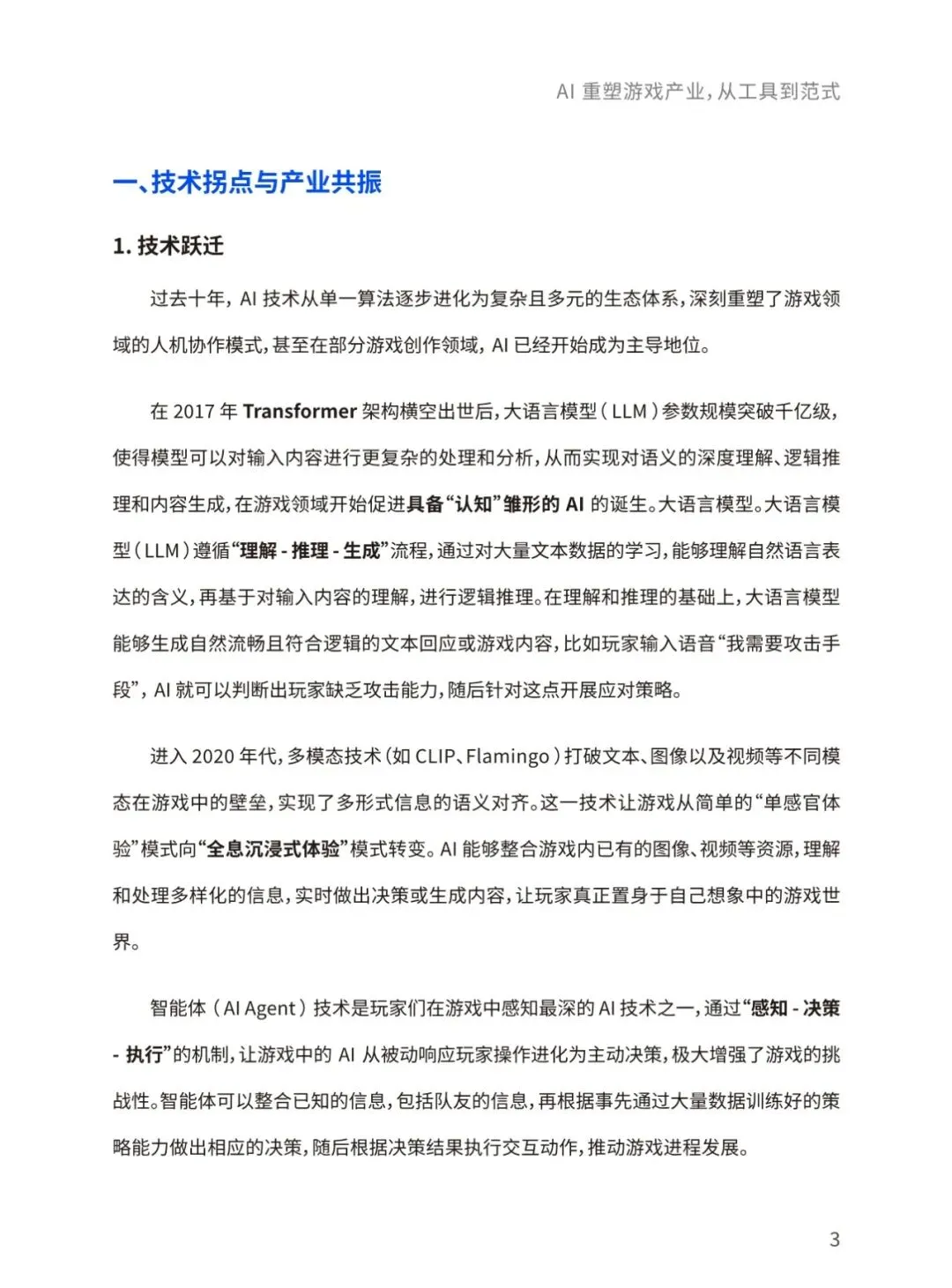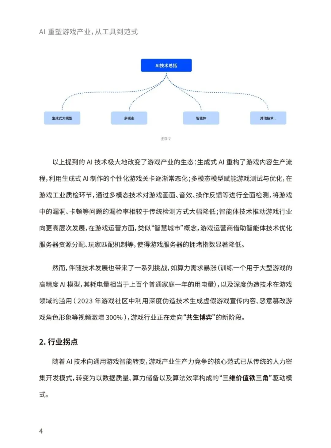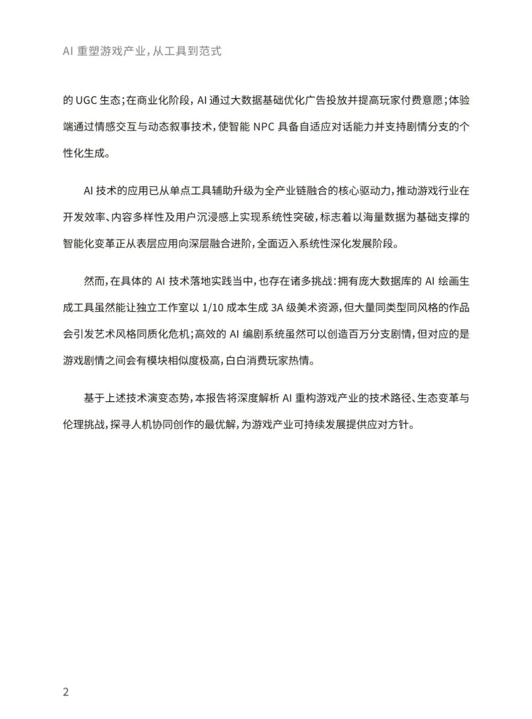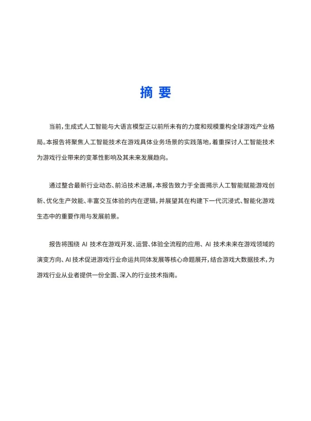 当前,生成式人工智能与大语言模型正以前所未有的力度和规模重构全球游戏产业格局。本报告将聚焦人工智能技术在游戏具体业务场景的实践落地,着重探讨人工智能技术为游戏行业带来的变革性影响及其未来发展趋向。通过整合最新行业动态、前沿技术进展,本报告致力于全面揭示人工智能赋能游戏创新、优化生产效能、丰富交互体验的内在逻辑,并展望其在构建下一代沉浸式、智能化游戏生态中的重要作用与发展前景。报告将围绕AI技术在游戏开发、运营、体验全流程的应用、AI技术未来在游戏领域的 演变方向、AI技术促进游戏行业命运共同体发展等核心命题展开,结合游戏大数据技术,为游戏行业从业者提供一份全面、深入的行业技术指南。