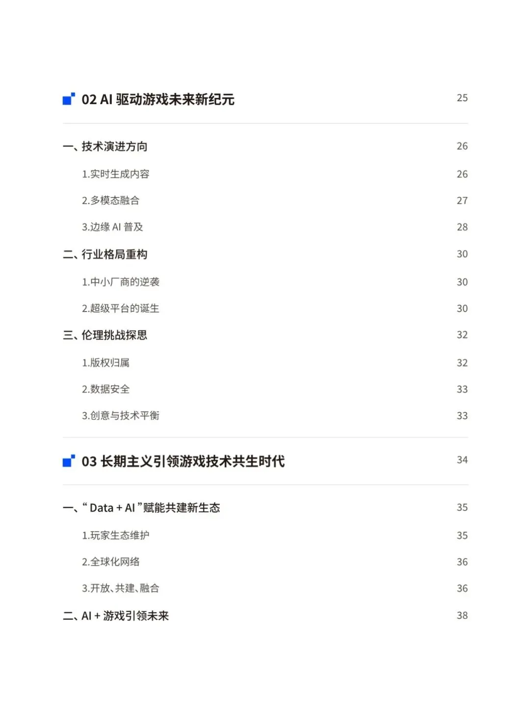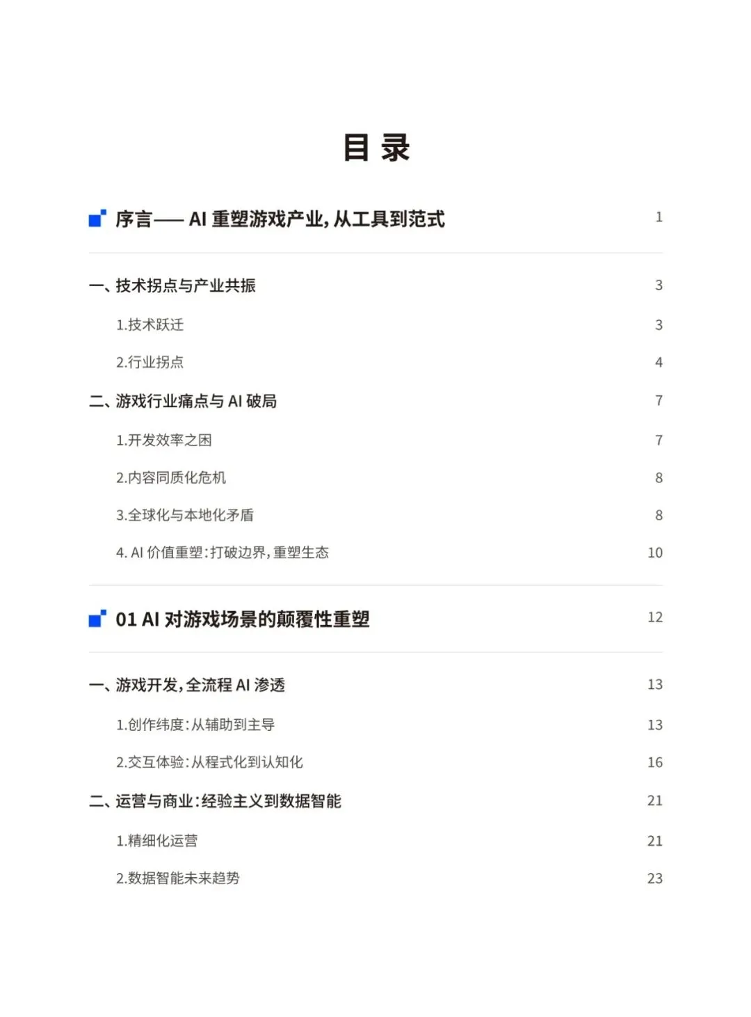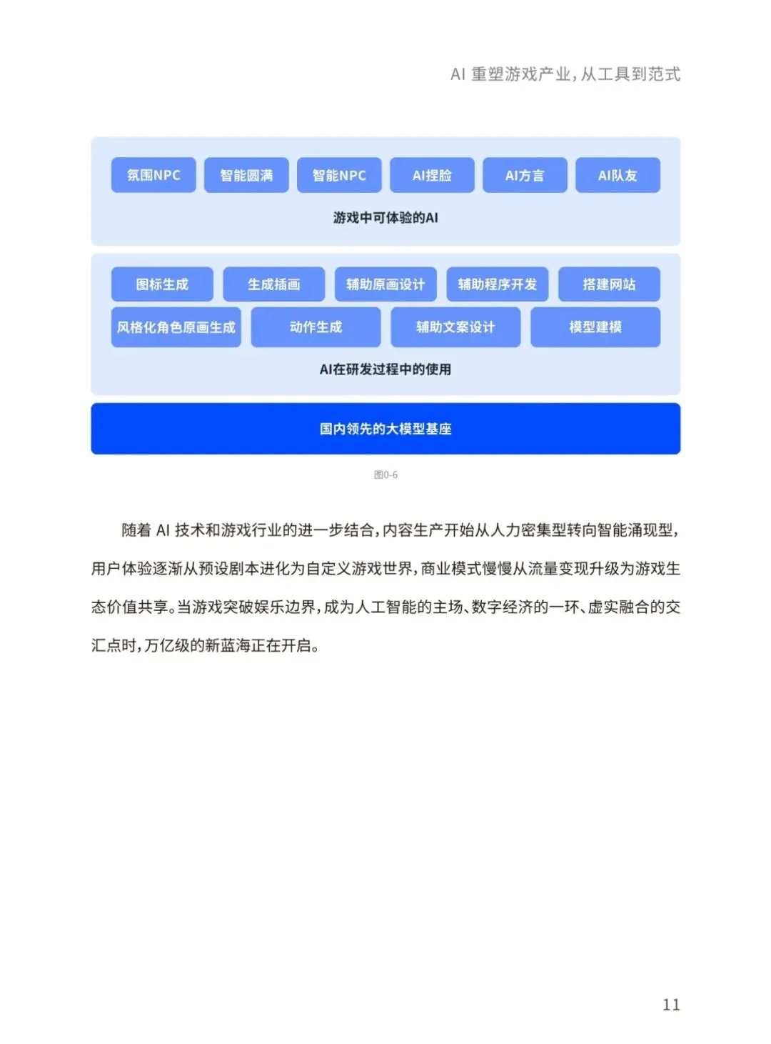 当前,生成式人工智能与大语言模型正以前所未有的力度和规模重构全球游戏产业格局。本报告将聚焦人工智能技术在游戏具体业务场景的实践落地,着重探讨人工智能技术为游戏行业带来的变革性影响及其未来发展趋向。通过整合最新行业动态、前沿技术进展,本报告致力于全面揭示人工智能赋能游戏创新、优化生产效能、丰富交互体验的内在逻辑,并展望其在构建下一代沉浸式、智能化游戏生态中的重要作用与发展前景。报告将围绕AI技术在游戏开发、运营、体验全流程的应用、AI技术未来在游戏领域的 演变方向、AI技术促进游戏行业命运共同体发展等核心命题展开,结合游戏大数据技术,为游戏行业从业者提供一份全面、深入的行业技术指南。